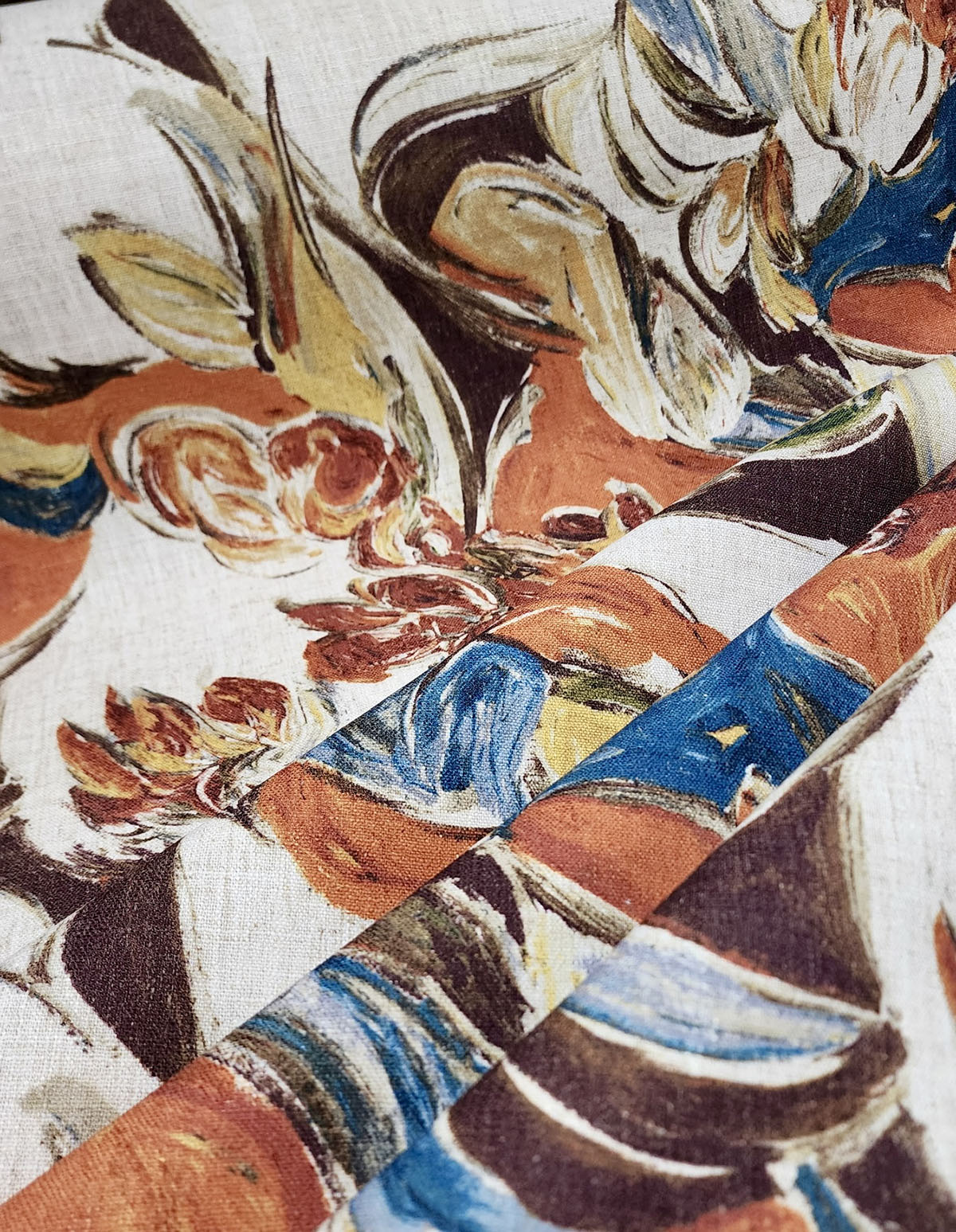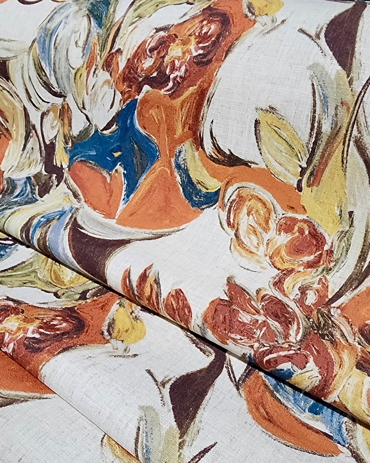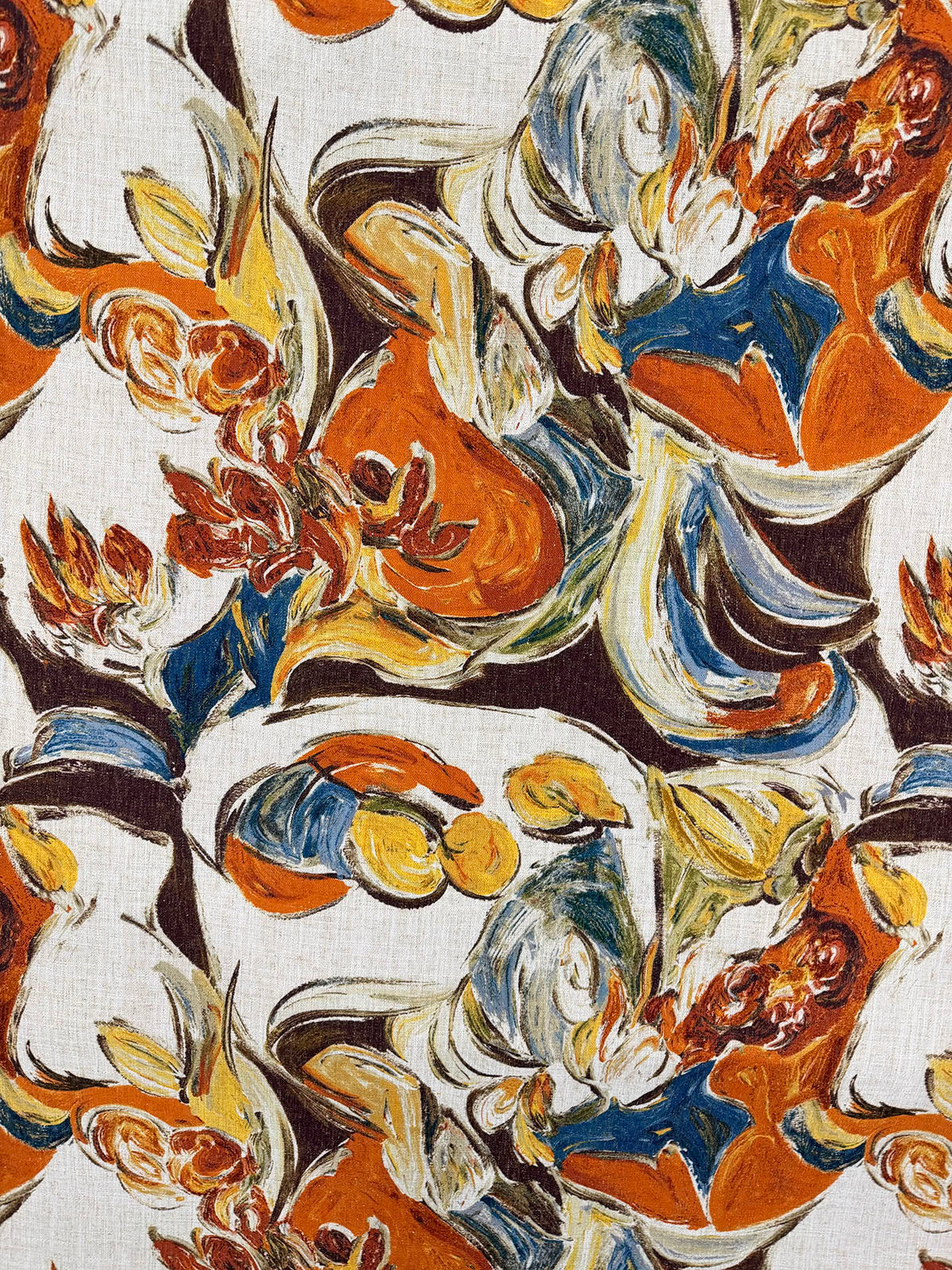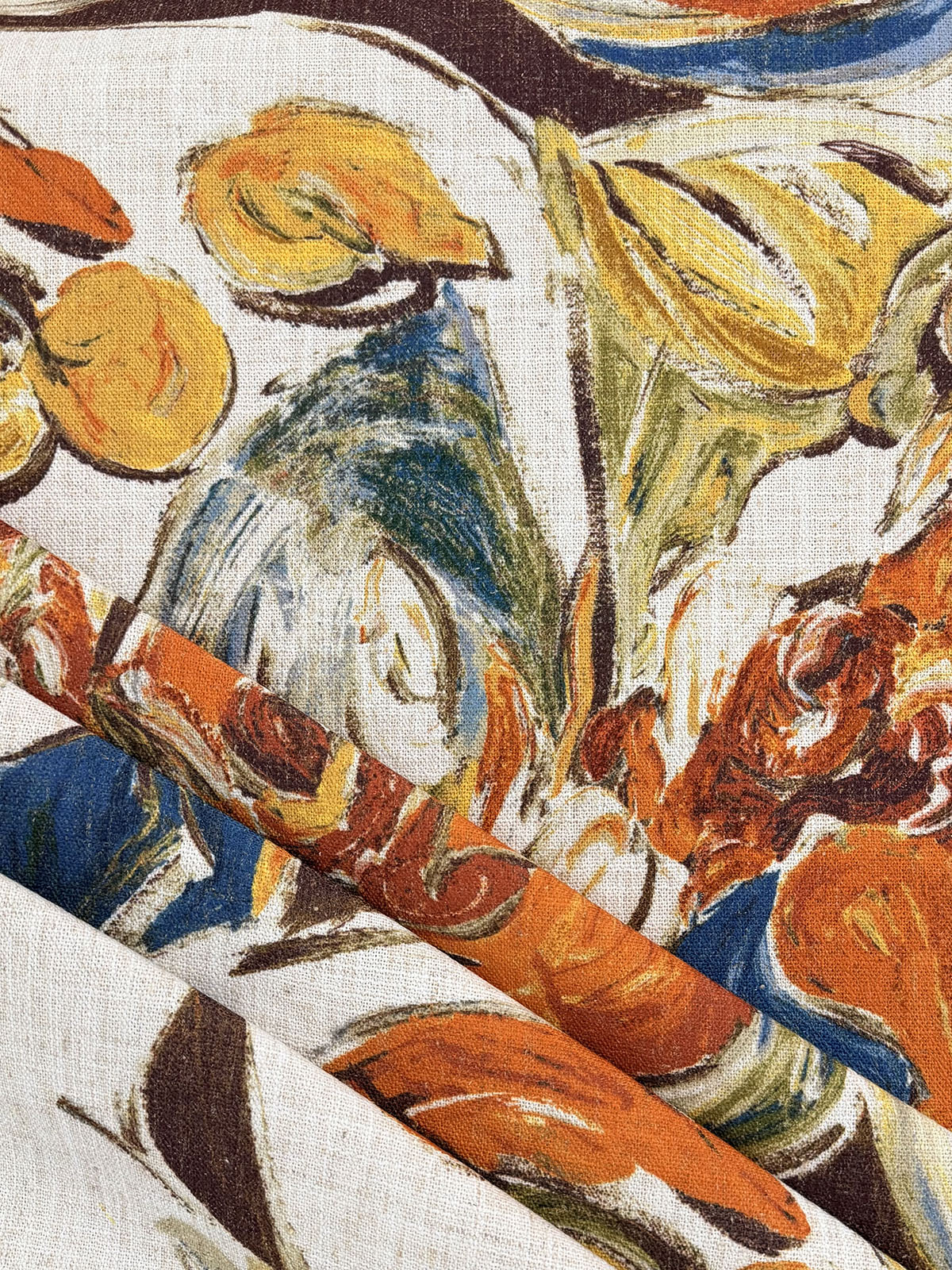 Krystin in color Multi is Railroaded Abstract Leaves fabric in blue, orange and gold colors, 54"Wide, 95% Polyester 5% Linen, Repeats: H=27" V=27" Double Rubs: 15,000