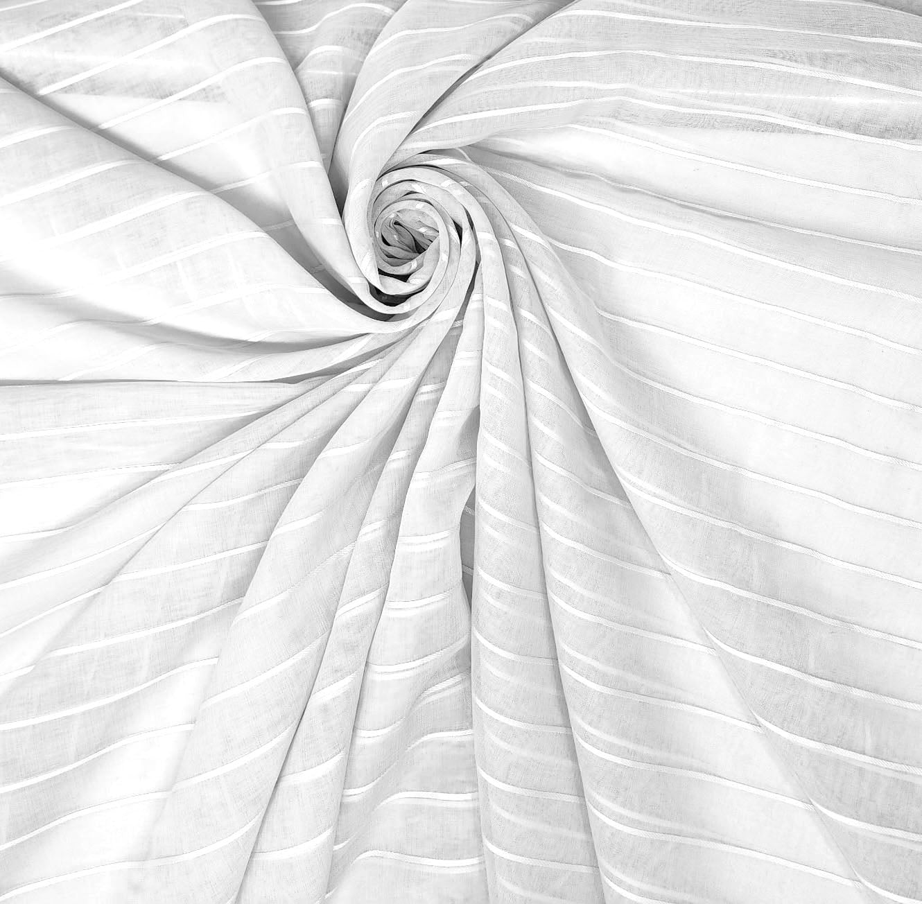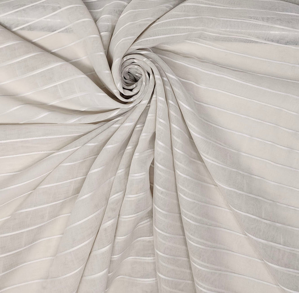 Manor in Snow is a 118" Stripped Sheer, 100% Polyester, Repeat: V=1.25", Passes NFPA 701. Made in Turkey
