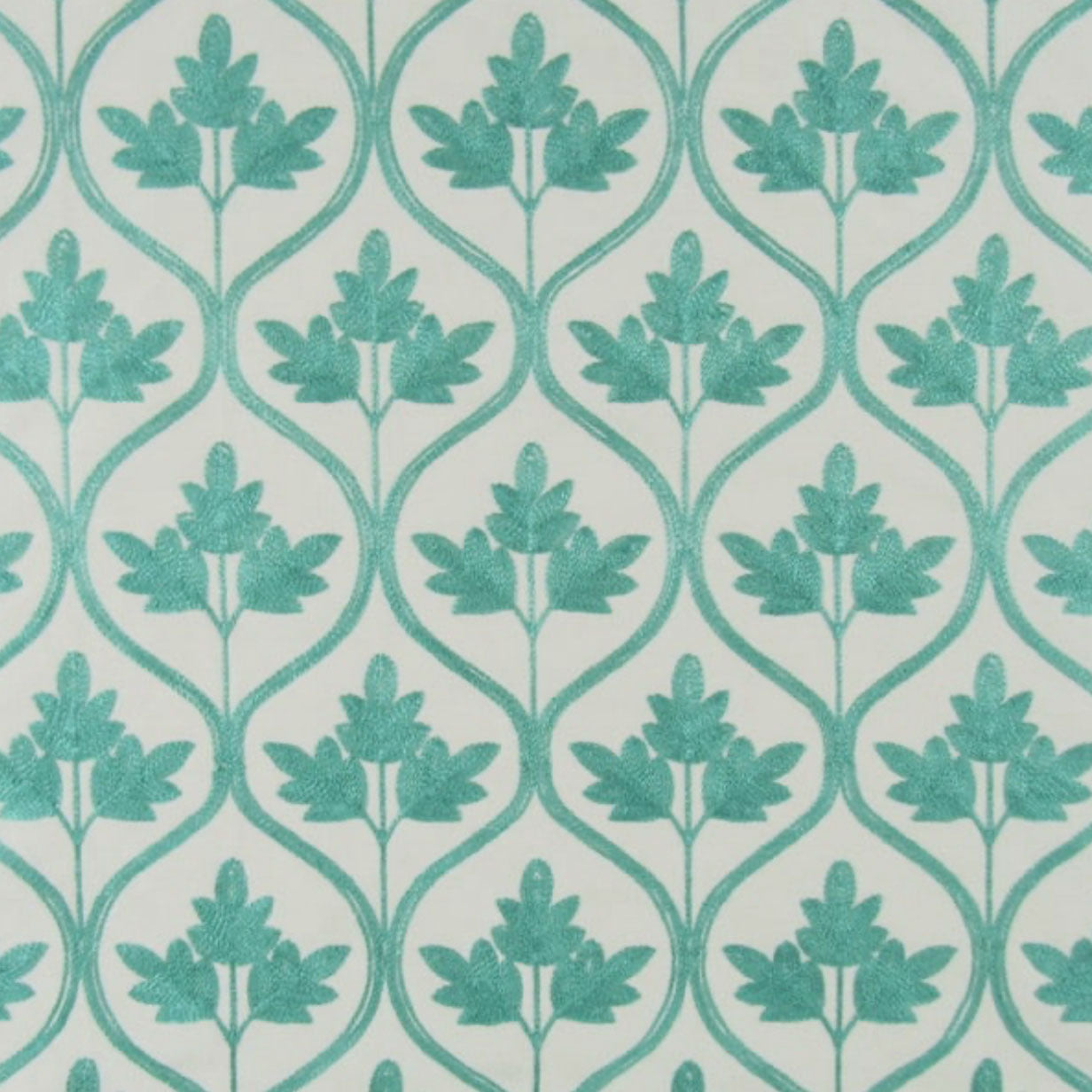 Mayfair in Aqua is an Embroidered Framed Floral, 53" Wide, 100% Polyester with Rayon Embroidery, Repeats: H=4.25" V=5.75