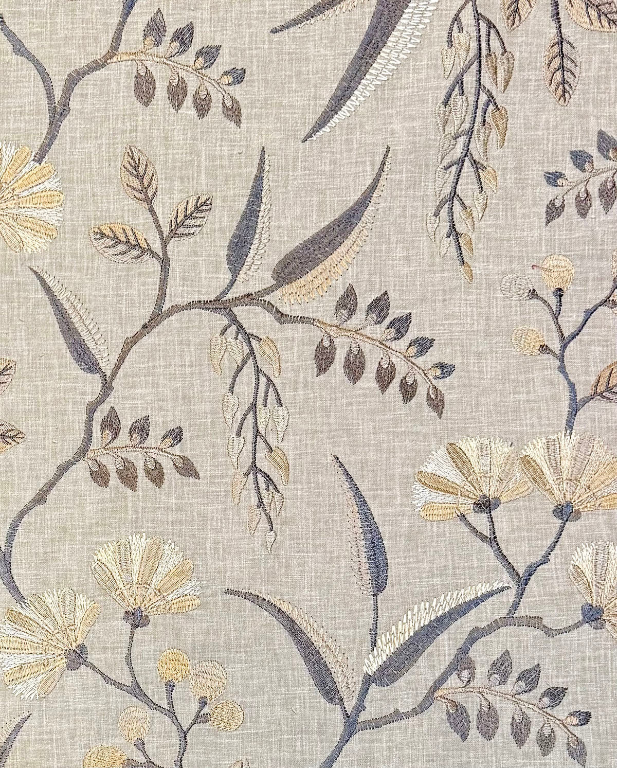 Philocalist in the color Shadow is an Embroidered Floral, 54" Wide, 52% Cotton 48% Polyester, Emb: 100% Rayon, Repeats: H=25.25 V=18.375" Double Rubs: 20,000