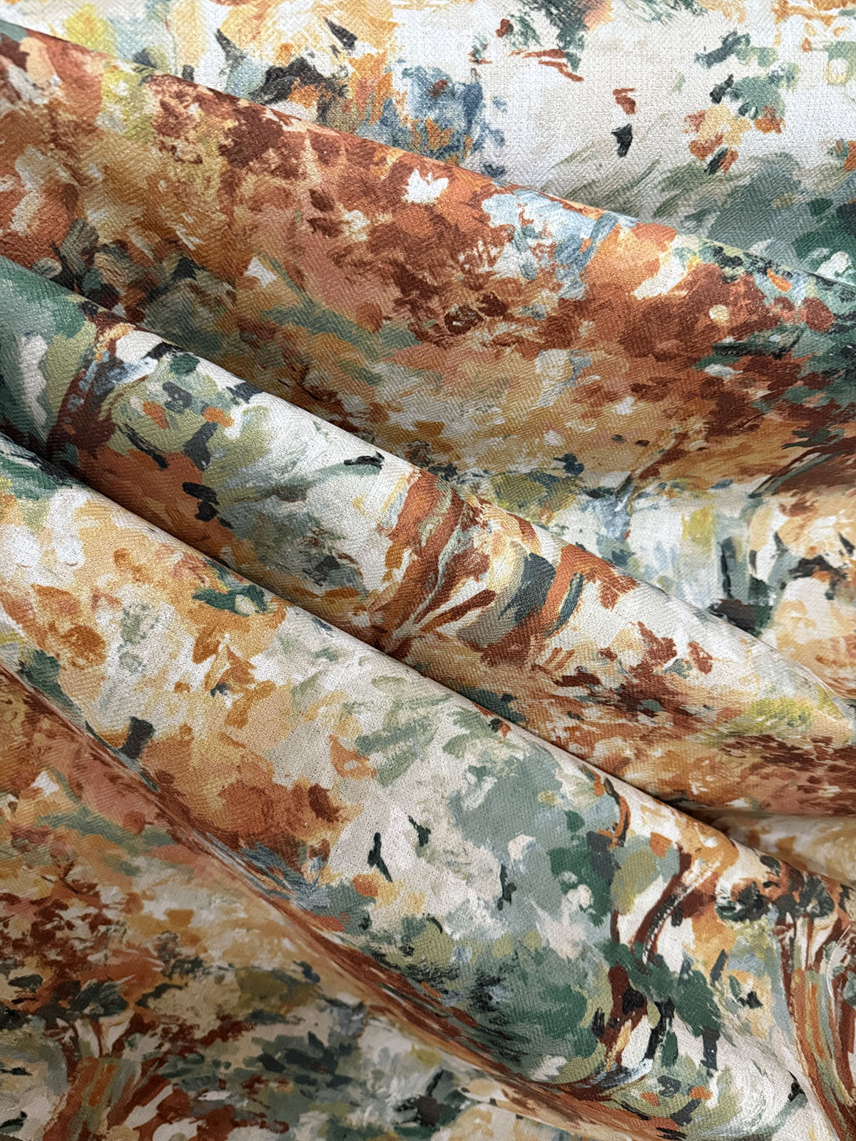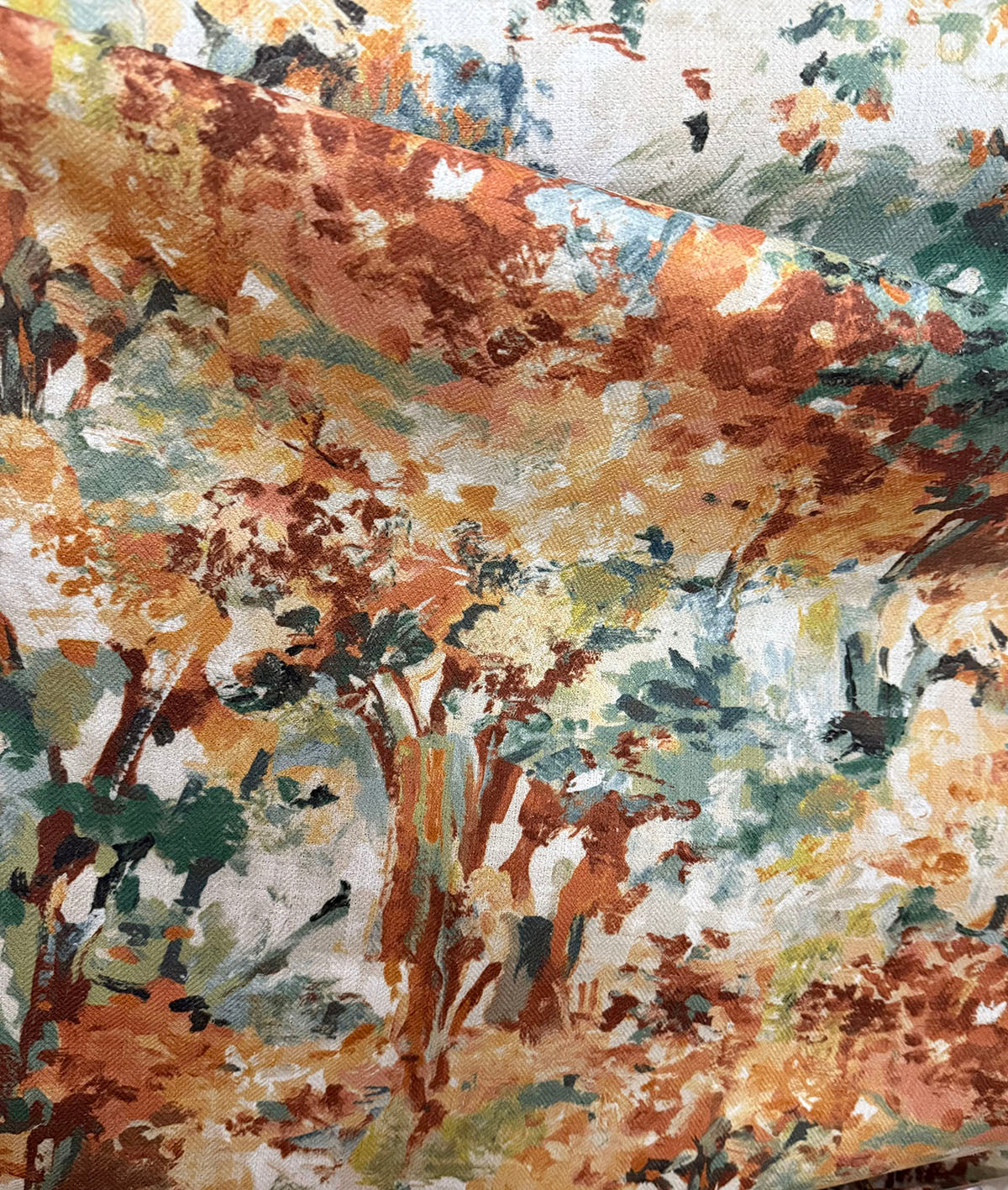 Treemendous in 344 Spice is an Abstract Trees fabric, 55.5" Wide, 92% Polyester 8% Linen, Repeats: H=27" V=26.75" Double Rubs: 50,000.